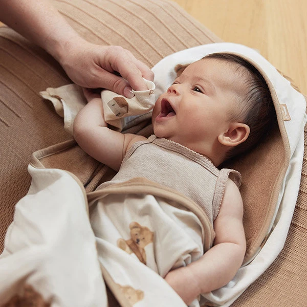 Met deze heerlijk zachte jersey badcape 75x75cm Teddy Bear GOTS, droog je jouw kleintje gauw af zodat het niet te snel afkoelt. De zachte badcape is gemaakt van 100% GOTS gecertificeerd katoen. De buitenkant is bedrukt met een mooie print en de binnenkant in biscuit kleur. Hang de badcape na gebruik gemakkelijk op aan het lusje.