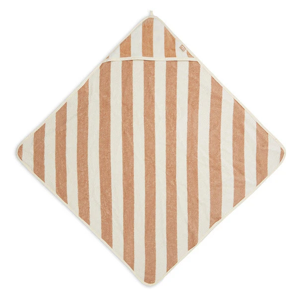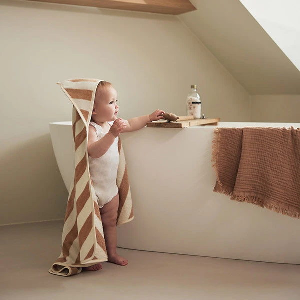 Met deze heerlijk zachte badcape Stripe Terry 75x75cm Biscuit GOTS, droog je jouw kleintje gauw af zodat het niet te snel afkoelt. De zachte badcape is gemaakt van 100% GOTS gecertificeerd organisch katoen. Na het badderen of zwemmen is deze badcape ideaal. Je wikkelt je baby direct warm in zodra hij uit het water komt. Met de capuchon bedek je het hoofd waardoor het daar ook geen warmte verliest. Comfortabel voor je baby! De zachte badstof is mild voor de tere babyhuid en neemt goed vocht op waardoor het afdrogen in een mum van tijd klaar is. Hang de badcape na gebruik gemakkelijk op aan het lusje.